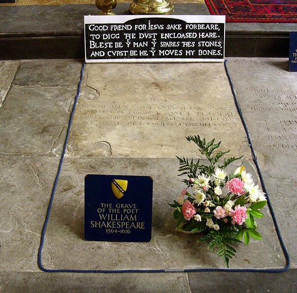 Born 450 years ago, Shakespeare died 23 April 1616 at Stratford-on-Avon and buried two days later in the chancel of the Holy Trinity Church. When the church underwent restoration work in 2008, his bones were not disturbed.