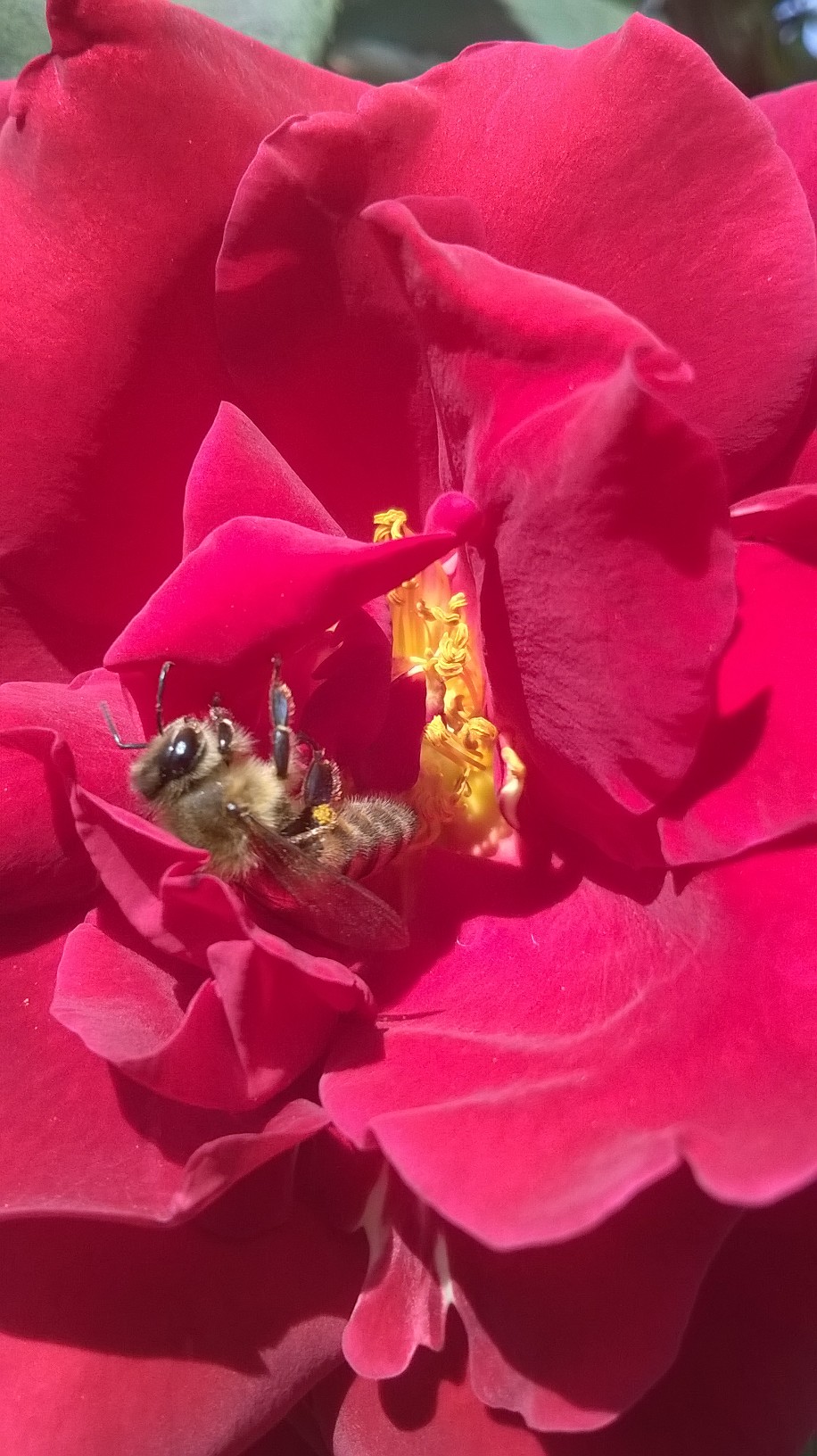 I don’t believe Mr. Bee is sunning; he must be drunk with nectar. After all, that is a red, red rose, not only captivating, but intoxicating. 😀 😀 😀