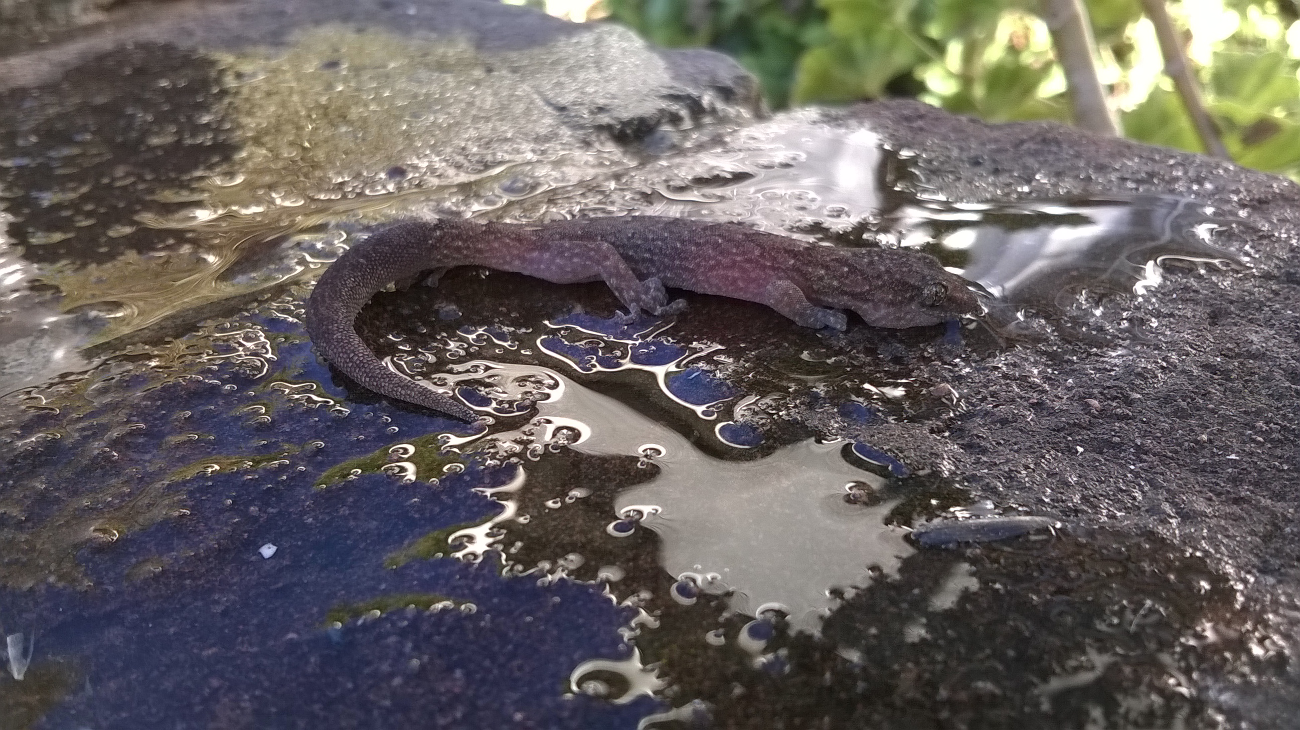 I rescued this little gecko from the birds’ water dish this morning. Since they rarely seek out drinking water, he must have blundered into it overnight during his nocturnal rambling. I think it was my fault, for placing the container down on the lower level to give the birds more area to get at the seed, but maybe the gecko climbed up and fell in.