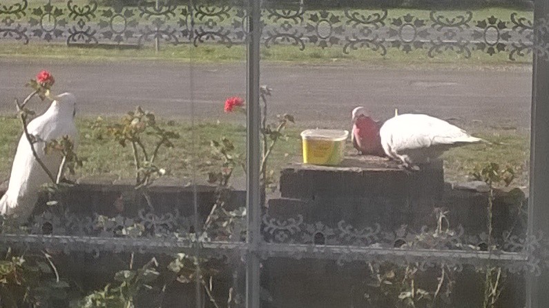 LOL. Hello Sue. They eyeballed each other a few times. A second galah was too nervous to stay with the cockies.