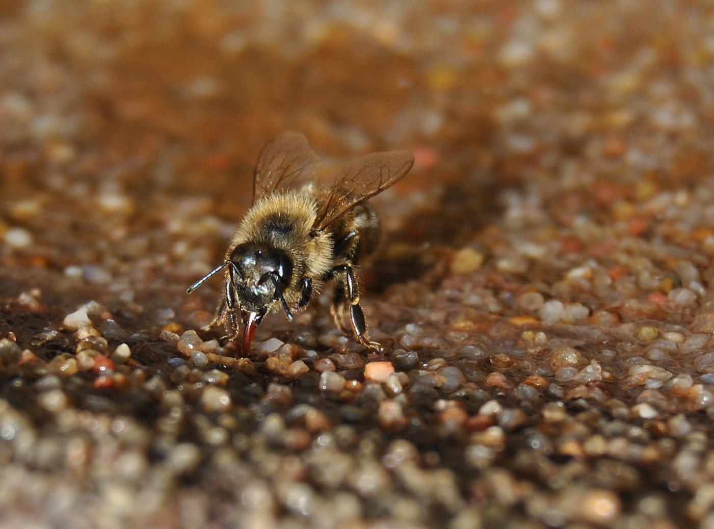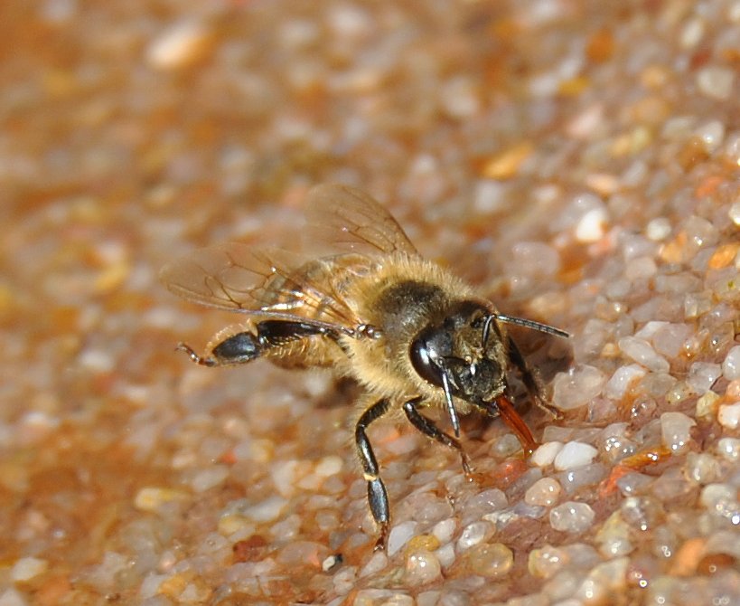 Wondering  Wandering around with the Nikon D3000 today, I spotted bees visiting the refilled ponds. I was surprised to see the unfurling of a red proboscis (tongue), not having photographed one before.