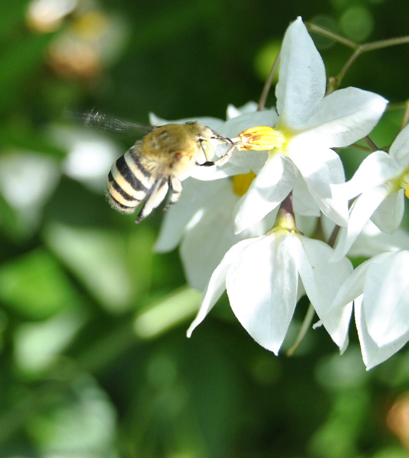 I’m thrilled to see the return of this solitary bee to my garden again. He is a zippy bee and rarely stays still, but I do fluke a decent photo now and then. Today, he was up high in the jasmine and I was surprised the images came out as good as they did. I do use the finest and largest setting so I can crop small areas out.