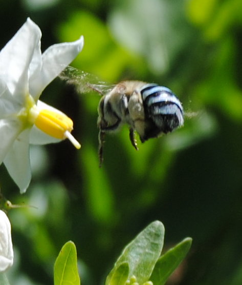 The blue-banded bee is a solitary bee. After the female has mated, she makes her nest and raises the young herself. She tunnels into the ground or into mud brick. They are in all Australian States except Tasmania.