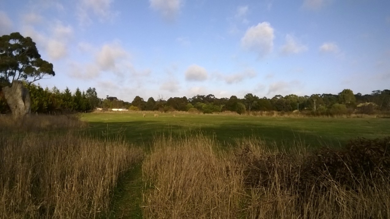 Walked a little further today – a street back from the main road. A pretty paddock with some woolly sheep. There are homes and vineyards beyond.