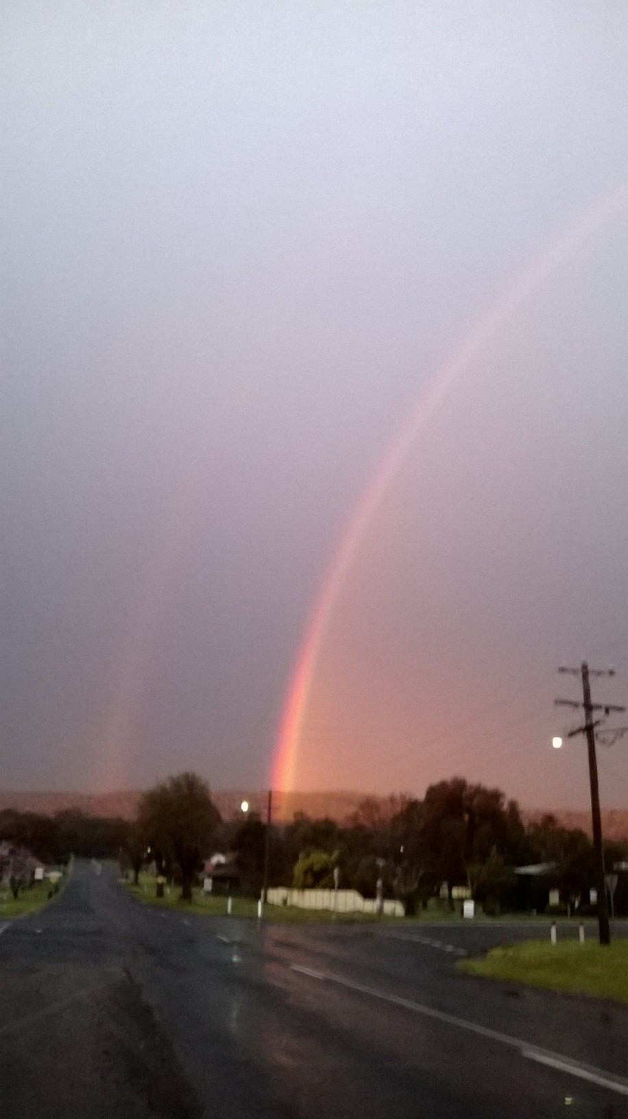 It is as I feared – photos on the phone always go grainy when it’s nearly flat or there is little light. The rainbow was actually glowing, and you can see that from the reflection on the road. The last sunlight is brushing the top of the range. It was still raining.