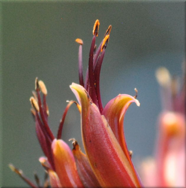 I decided to keep a lookout for proof. As soon as my hand was on the back door knob, the honeyeater flew down from the gum tree to a flax flower frond. Luckily, I’d not long hung washing on the line, so I had somewhere to hide when I snuck back to catch it in the act.