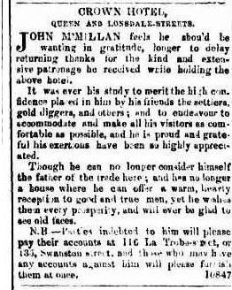 John McMillan was born in Durness, Sutherland, Scotland in 1816, the son of Ewan McMillan, foxhunter and game keeper, and Flora Mackay. John arrived in Australia some time before 1842 when his first publican’s licence was granted.