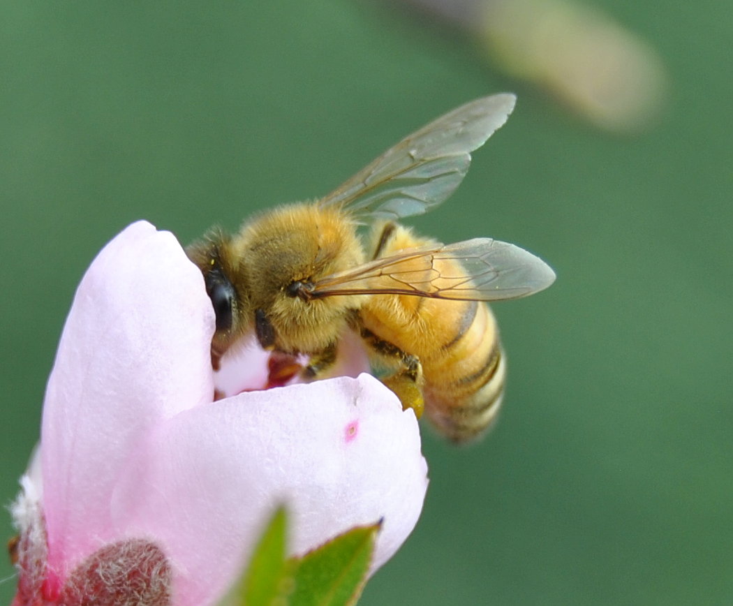 A bee in nectarine blossom, at the bottom of my garden.