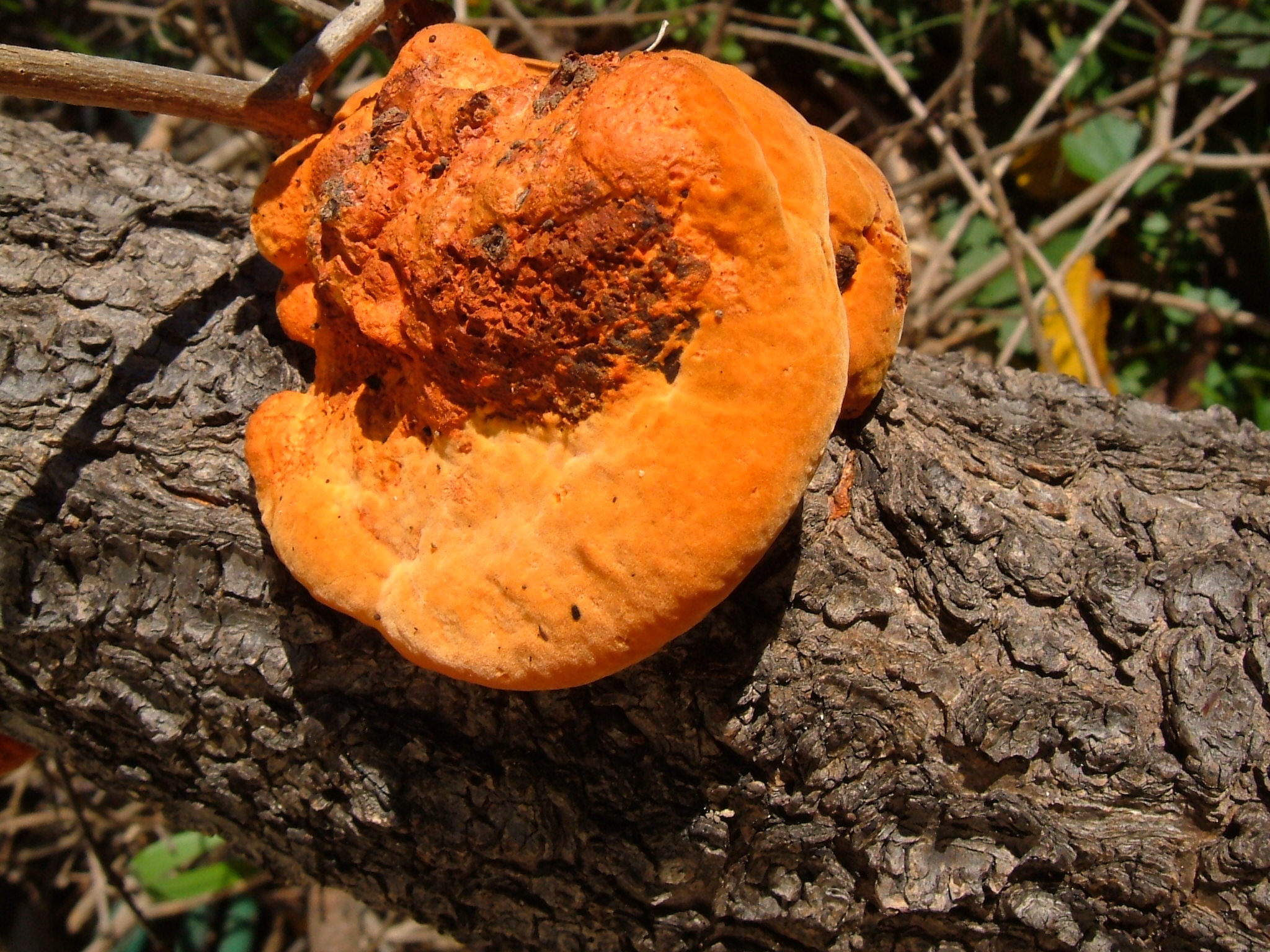 I know, I know, I have already put up orange themed photos this week, but I have some amazing orange funguses – I like that word more than fungi – in my yard, so wanted to share. They are growing on a dead tree limb.