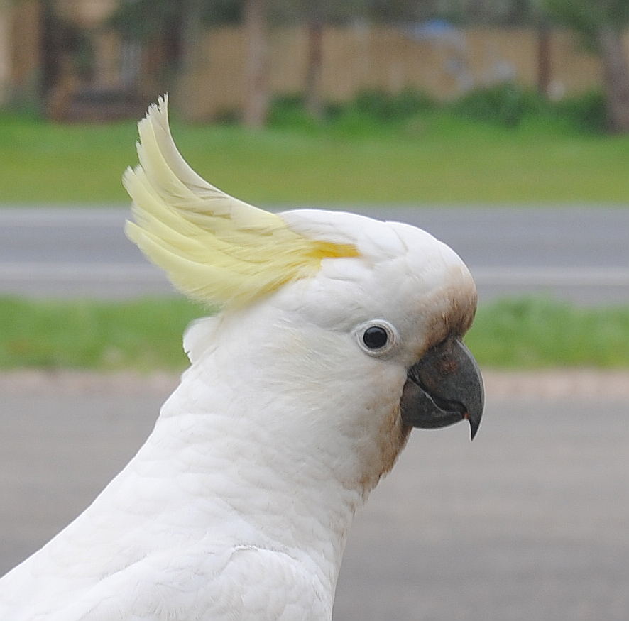 All these photos are of the same sulphur-crested cockatoo in rapidly changing light conditions. There were more cockies but they flew away when I came out with the camera. It was a very cold day, yesterday, with snow in lower areas than is usual. (Nikon D3000 on auto, cropped and overly-sharpened in GIMP)