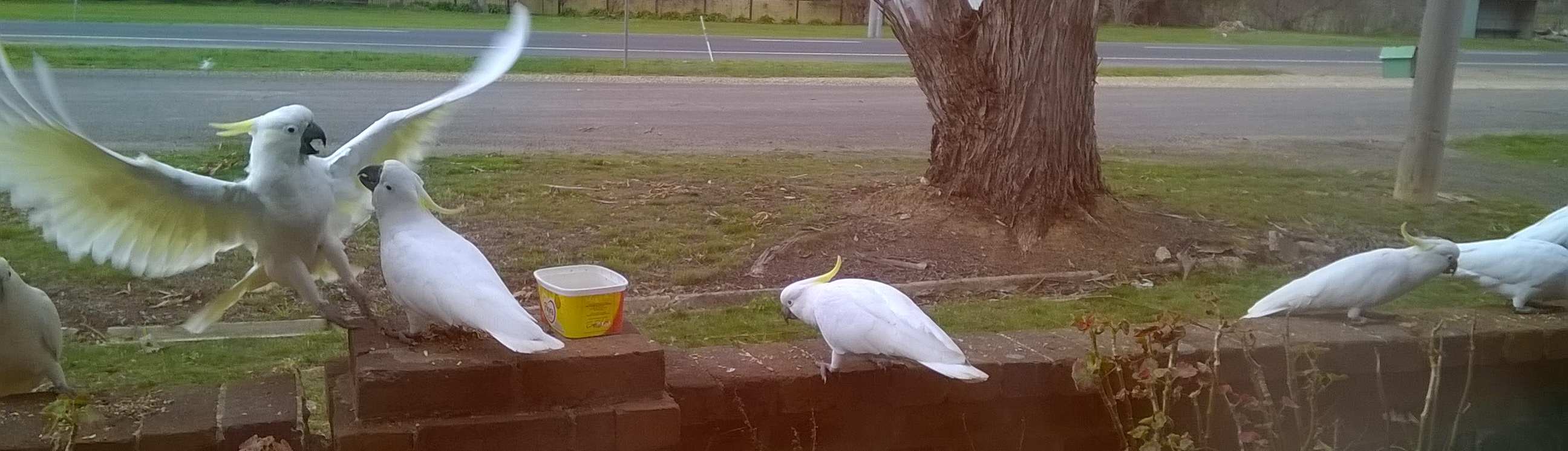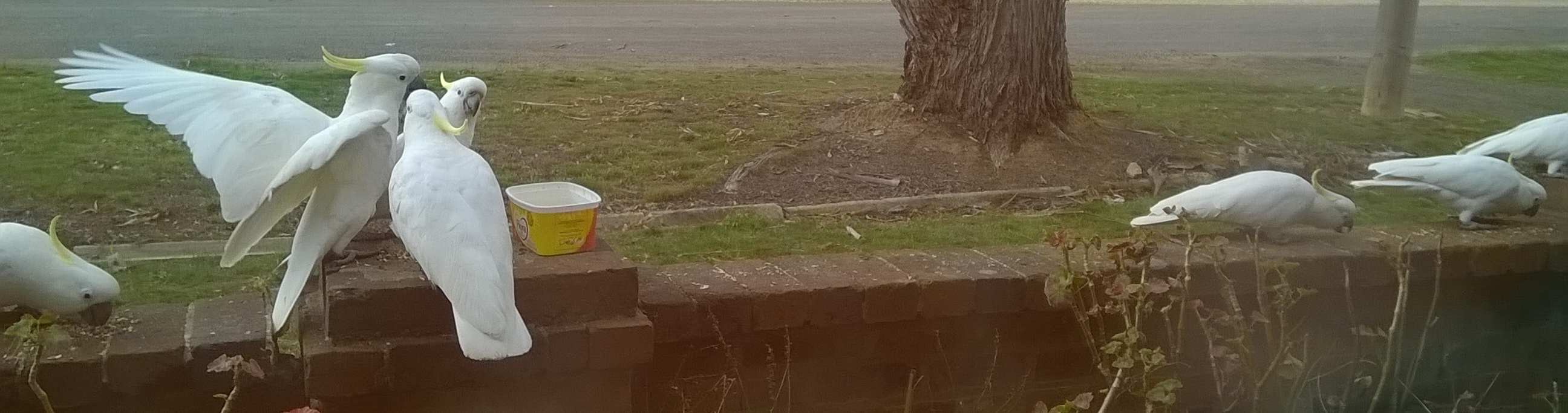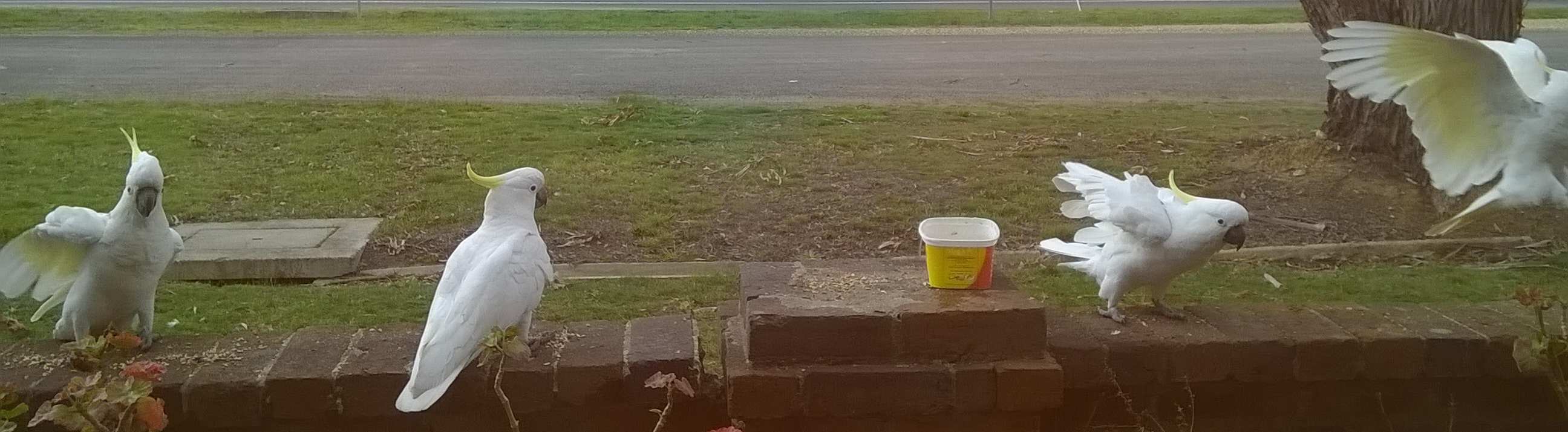 I think the cockatoo in the middle is one of our usual visitors, from the proprietary stance. Now, I discourage too many birds hanging about, so I didn’t hesitate to get closer to the window. I shoved the camera through the gap in the netting and off they went. The two in the gum-tree were hardly fazed.